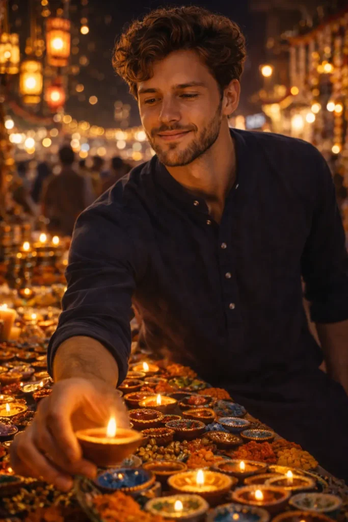 Stylish young man (face from uploaded reference image) wearing a navy blue pathani kurta with silver buttons, standing in a busy Diwali street market at night. He is reaching out to pick up a diya from a vendor stall filled with colourful clay lamps, candles, and festive decorations. His body is slightly leaning forward, expression warm and relaxed. Golden light from surrounding stalls illuminates his face naturally. Background bokeh features glowing lanterns, a lively crowd, and decorative lights. 8K ultra-realistic, cinematic lifestyle shot, DSLR quality, shallow depth of field.